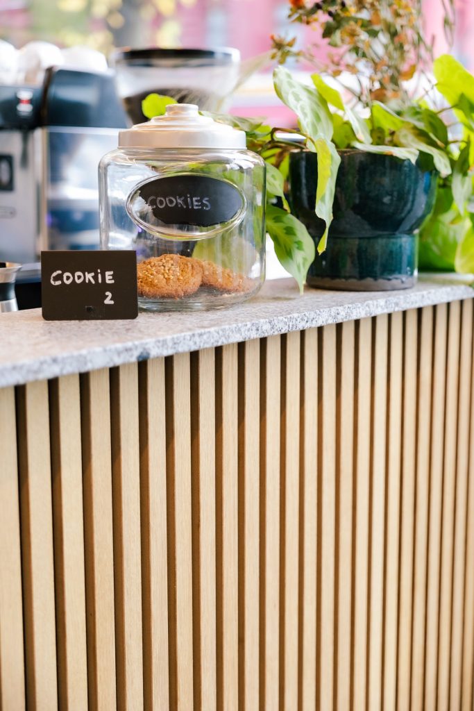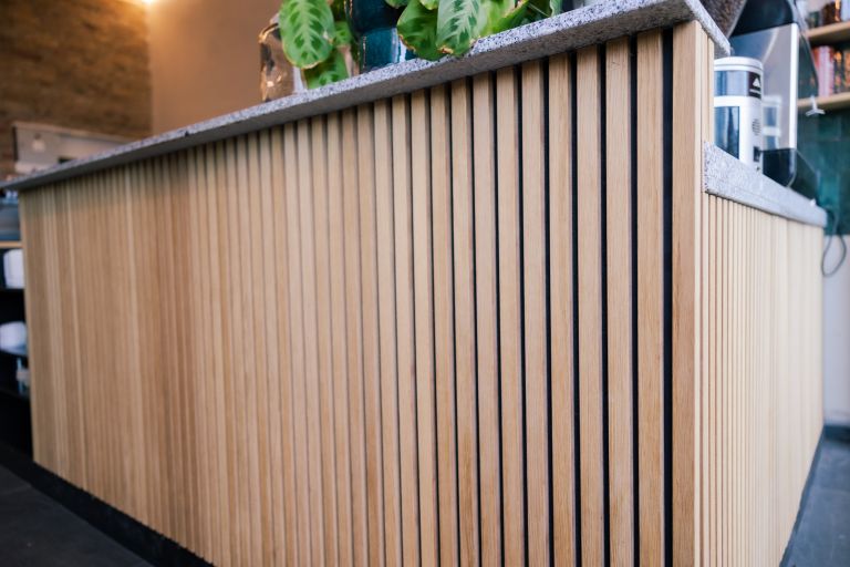 Beim Umbau des Cafè’s hat Jonathan sich für die WoodUpp Paneele in Eiche Klassisch mit schwarzem Filz entschieden. Diese wurden an der Decke sowie im Tresenbereich verwendet und kreieren eine ganz besondere, gemütliche und einladende Atmosphäre.