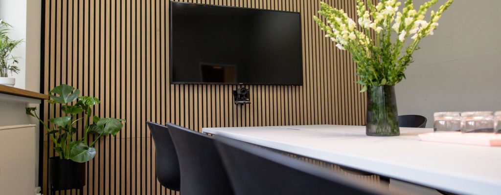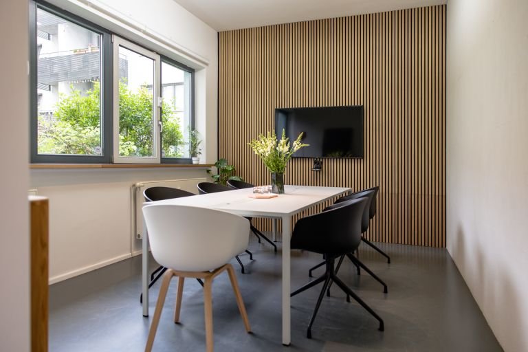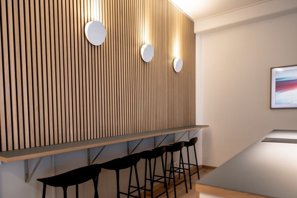 Mach ein Foto, wähle ein Modell und sieh Dir dieses an Deiner Wand an. Im Bureau Oberhaeuser wurde das Modell Akupanel | Eiche Klassisch mit dem schwarzen Filz gewählt.