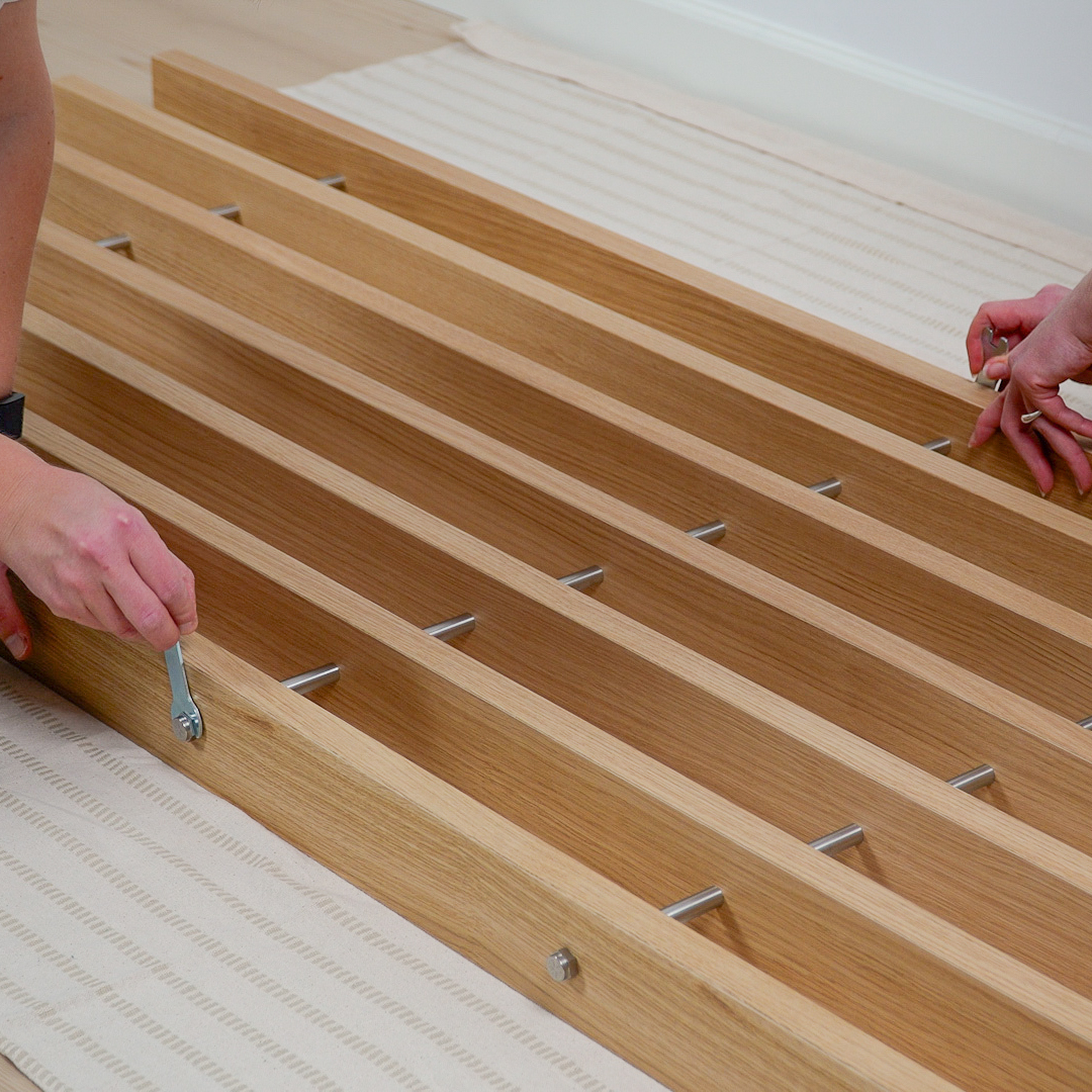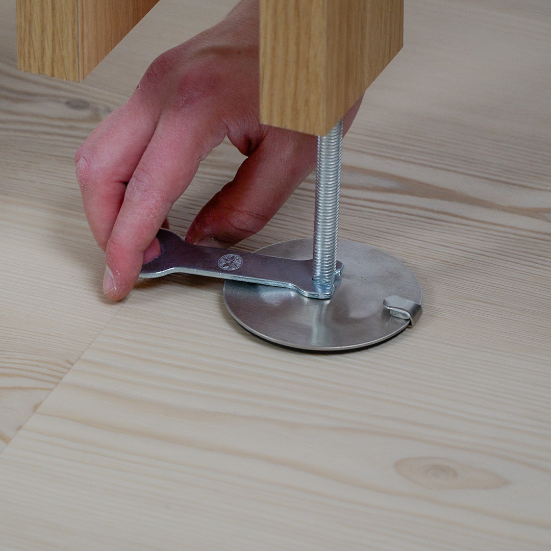 Embrace wird mit einem Spannungssystem installiert, das es den Modulen ermöglicht, sicher zwischen Boden und Decke zu stehen. Für zusätzliche Stabilität muss das System sowohl im Boden als auch in der Decke mit Schrauben gesichert werden.