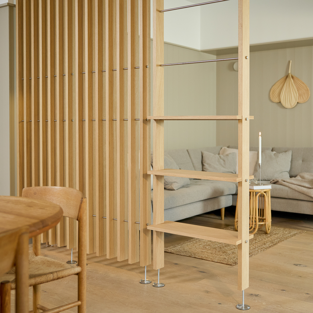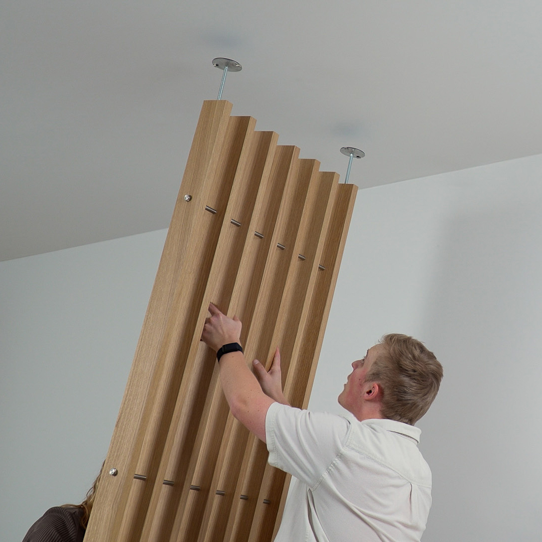 Embrace ist ein Raumteiler-System von Boden bis Decke. Es ermöglicht Ihnen, offene Räume zu teilen, ohne Wände zu bauen oder Licht zu blockieren. Das System wird zwischen Boden und Decke installiert und schafft klare Zonen in Ihrem Zuhause.