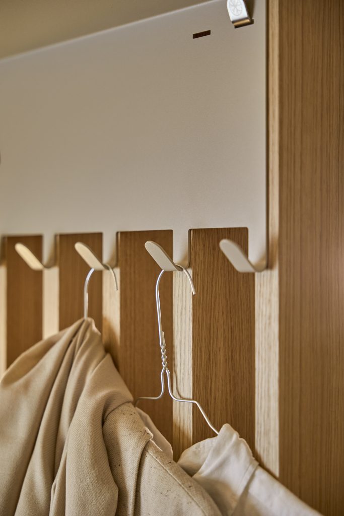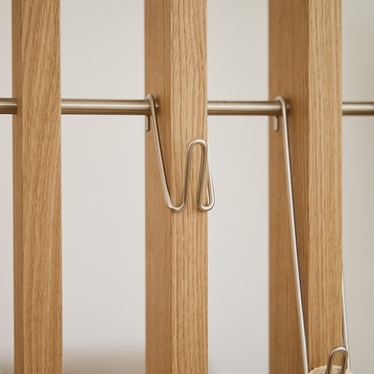 Embrace besteht aus Eichenfurnier und Edelstahl und besteht aus modularen Elementen, die im Laufe der Zeit angeordnet und angepasst werden können. Es ist so konzipiert, dass es den Raum teilt, während es die Räume offen und nutzbar hält.