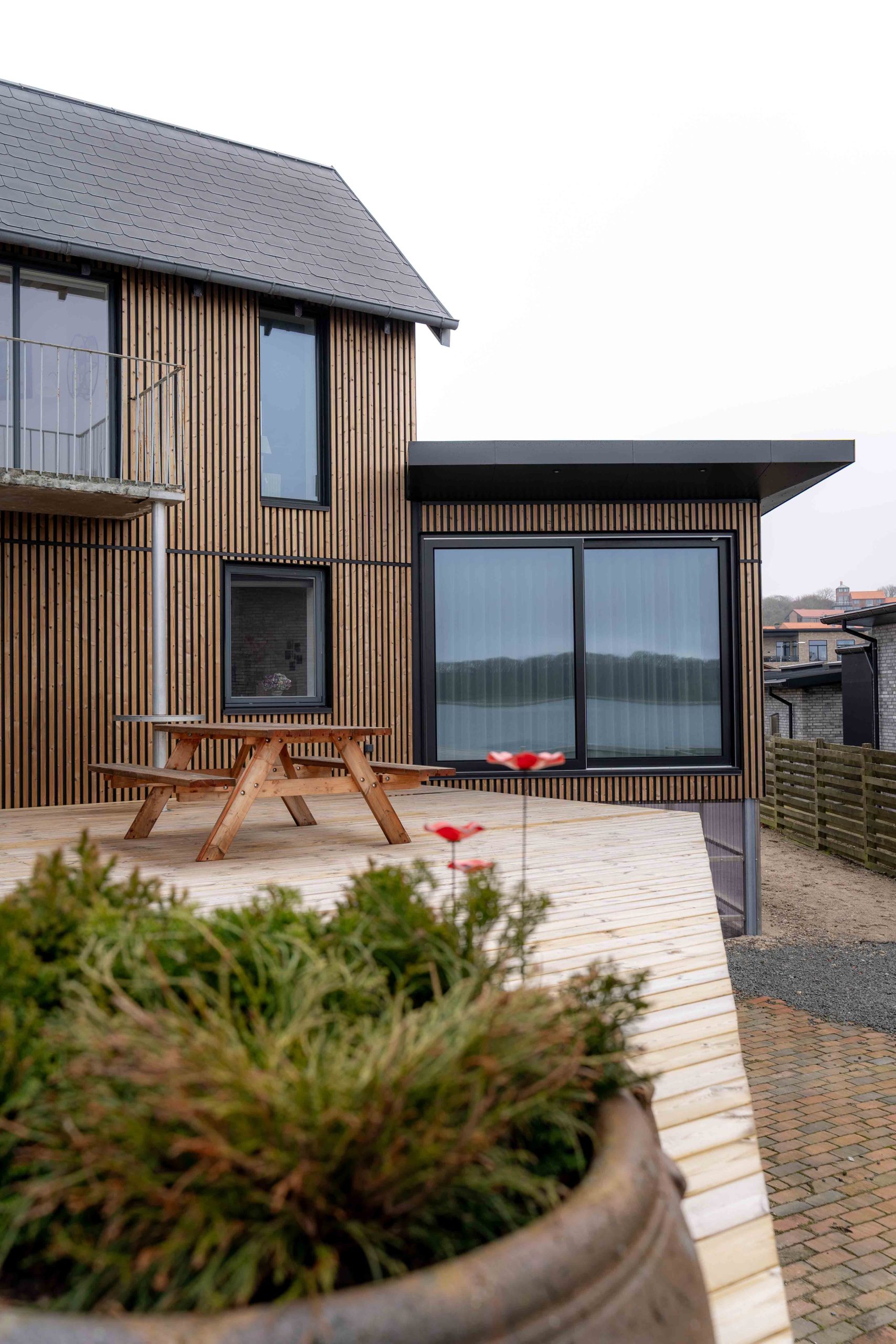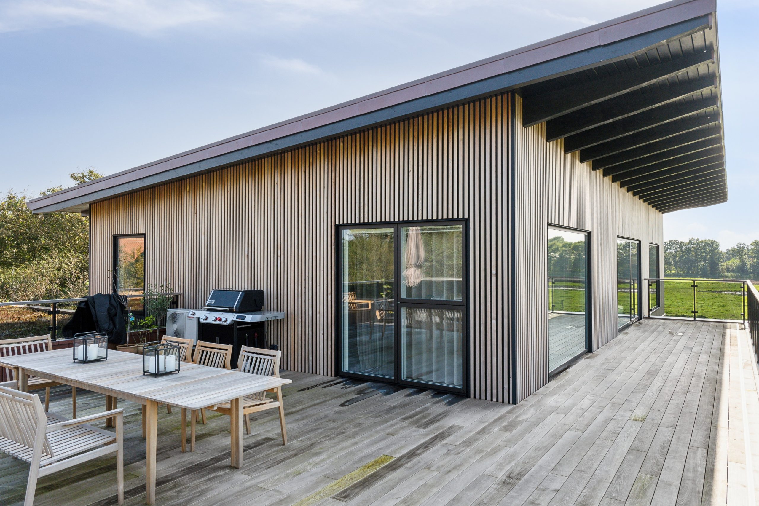 Hergestellt aus thermisch behandeltem Holz und beschichtetem Aluminium, ermöglichen unsere Paneele, die Außenbereiche in einem zeitlosen skandinavischen Design zu gestalten.