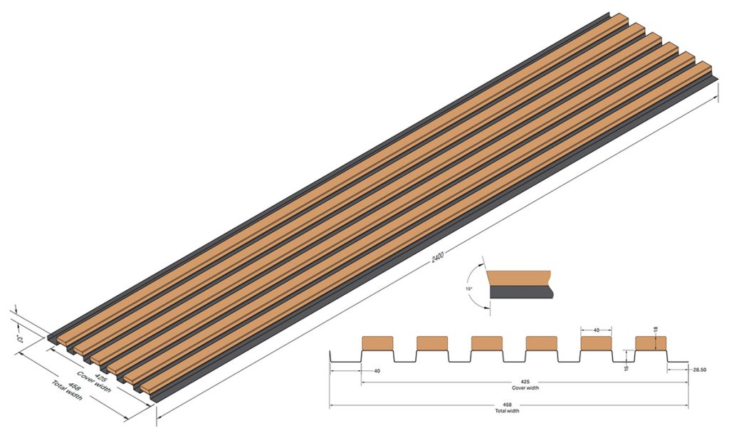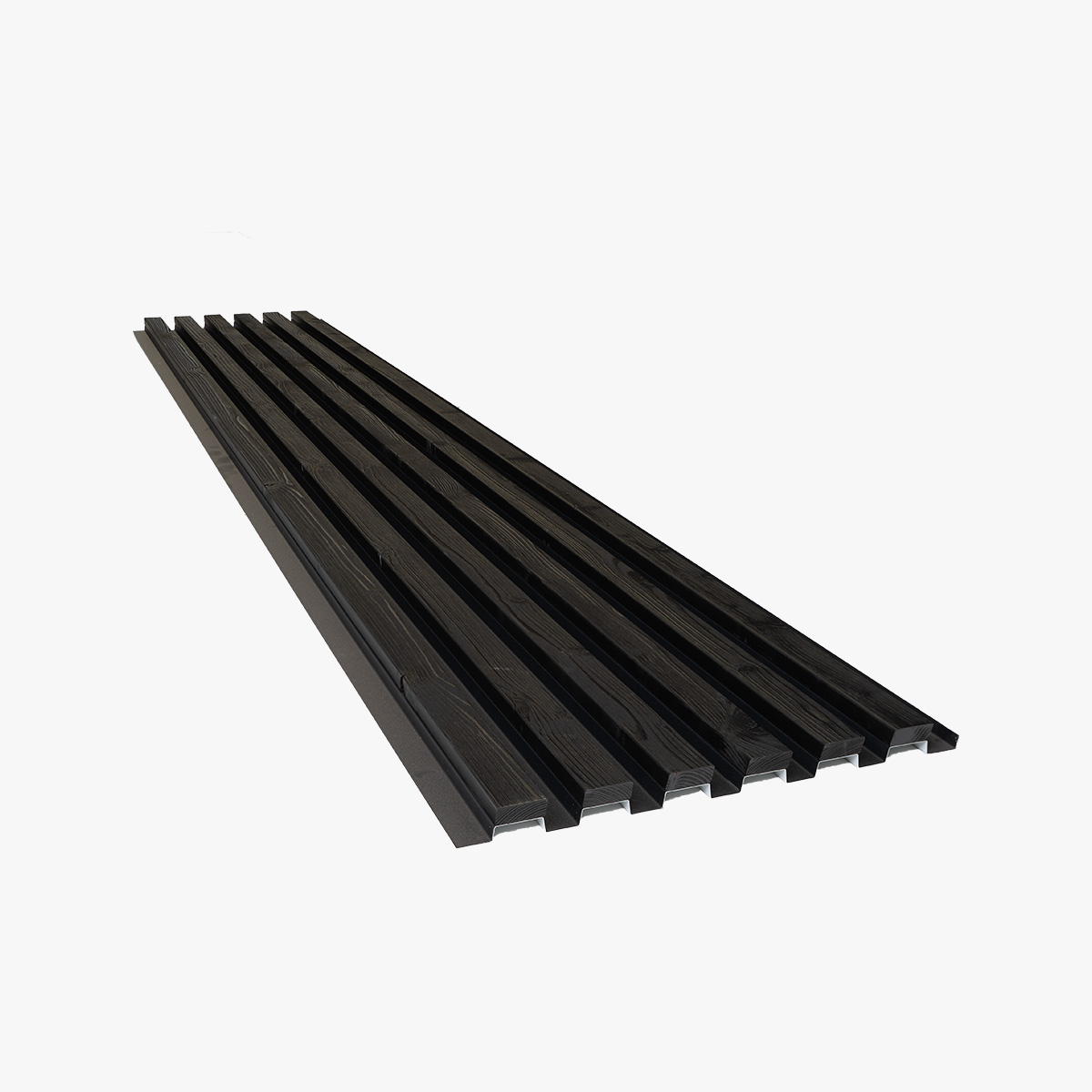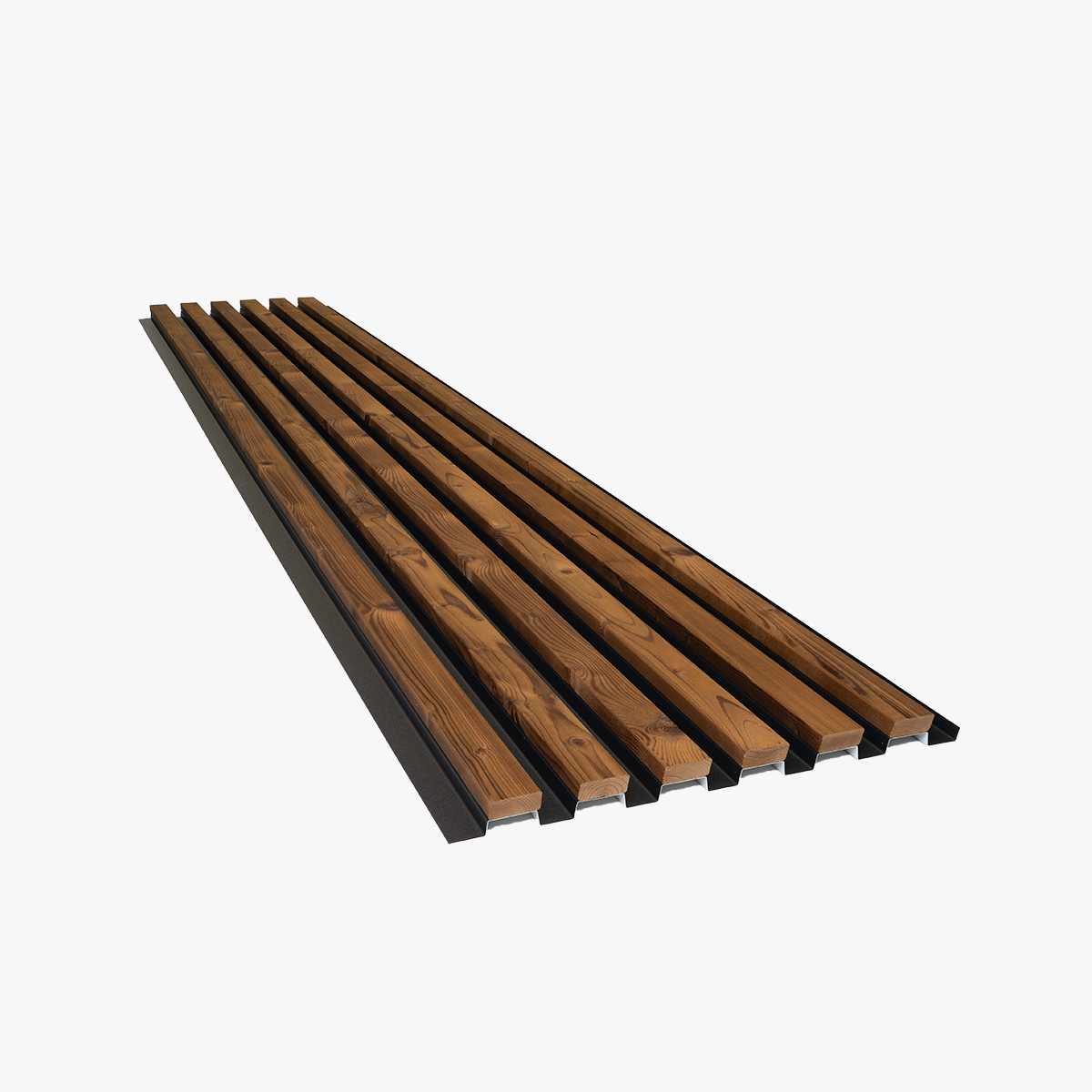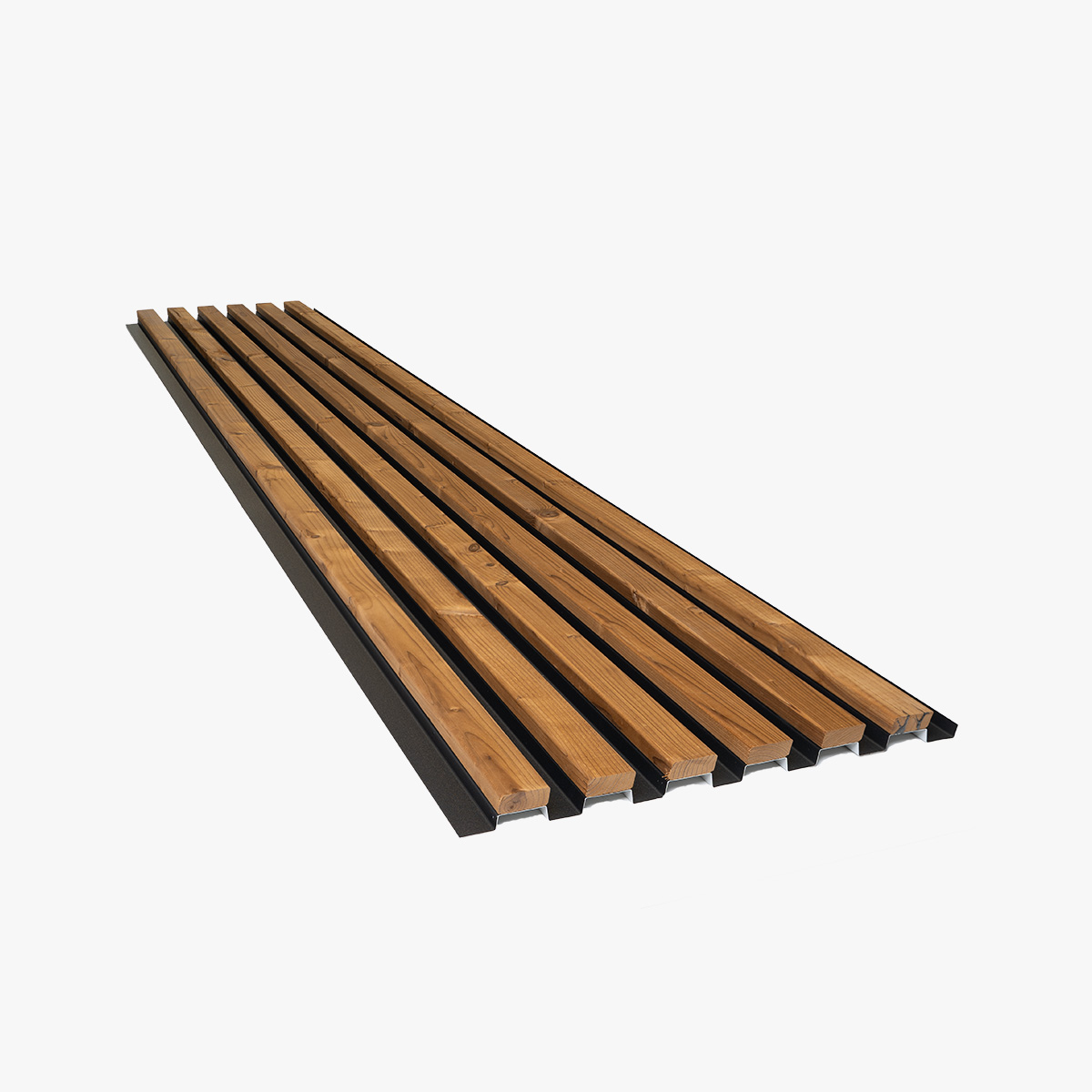 Thermisch behandelte Fichtenlatten sind mit einem pulverbeschichteten Aluminiumträger verbunden – eine Konstruktion, die in Skærbæk, Dänemark, entwickelt und hergestellt wurde. Das Ergebnis ist die Wärme und die Maserung von echtem Holz, gehalten von einer Struktur, die sich nicht verzieht, verdreht oder durchhängt.