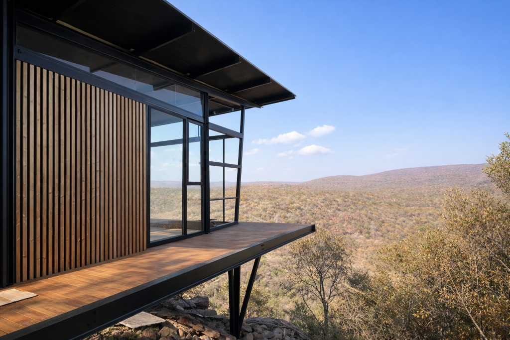 Aluwood bewahrt die Wärme und Maserung des Holzes – ohne Verziehen, Rissbildung und Durchhängen. Thermisch behandeltes Fichtenholz verbindet sich mit pulverbeschichtetem Aluminium. Holz sorgt für das Aussehen. Aluminium hält die Form.