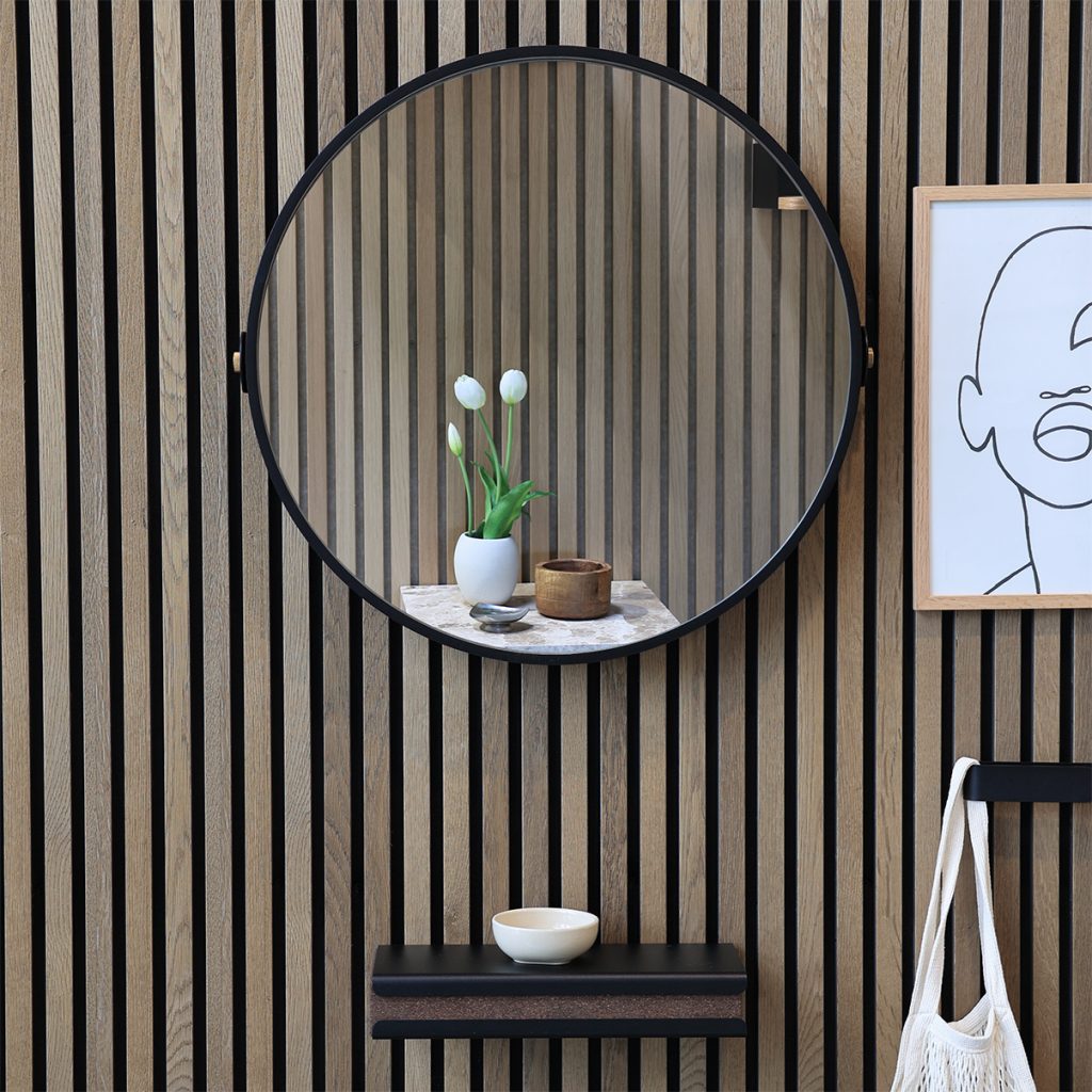 Mit einem Durchmesser von 60 cm hat der Spiegel genau die richtige Größe für Flur, Schlafzimmer oder Badezimmer. Ergänze ihn mit einer Hintergrundbeleuchtung oder positioniere ein schwebendes Regal darunter – für ein harmonisches, stimmiges Gesamtbild.