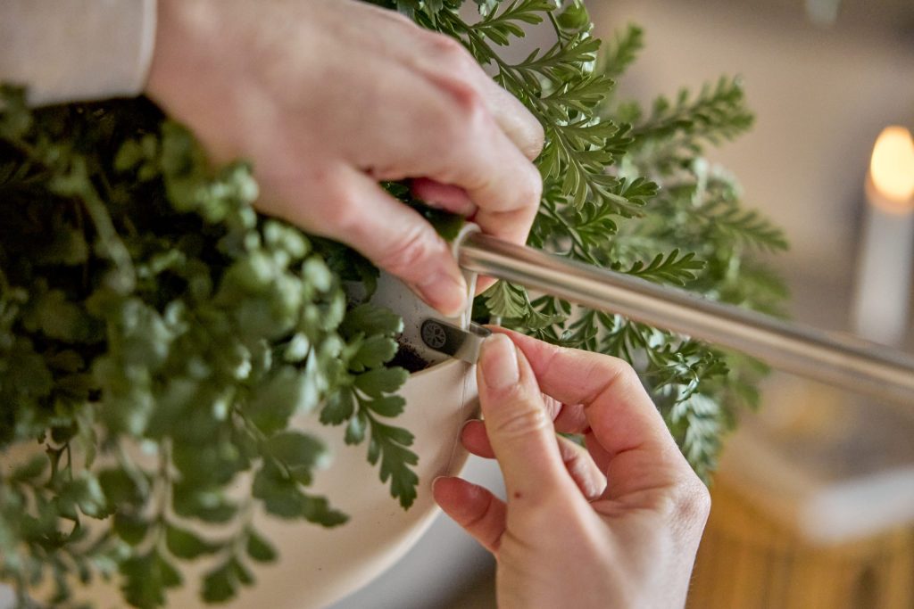 Hänge die Tasche an BM2 mit den Metallclips. Spreize sie, um das Gleichgewicht vor dem Pflanzen zu halten, oder verwende sie als weiche Aufbewahrung für kleine Gegenstände. Bewege sie, wann immer sich dein Setup ändert.